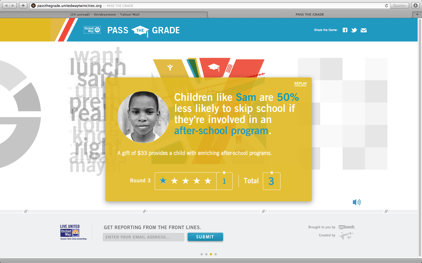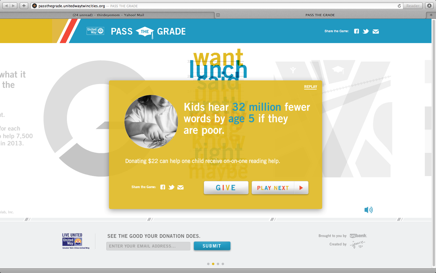The game, developed by Space 150 and supported by U.S. Bank, takes players through four unique challenges that test if they have what it takes to pass the third grade. (Students who fall behind by third grade are four times more likely to drop out of high school.) After each challenge, statistics on childhood poverty are shared. Upon completion of the game, a grade is given to the player. Players are then asked to share their results via social media to encourage additional donations.