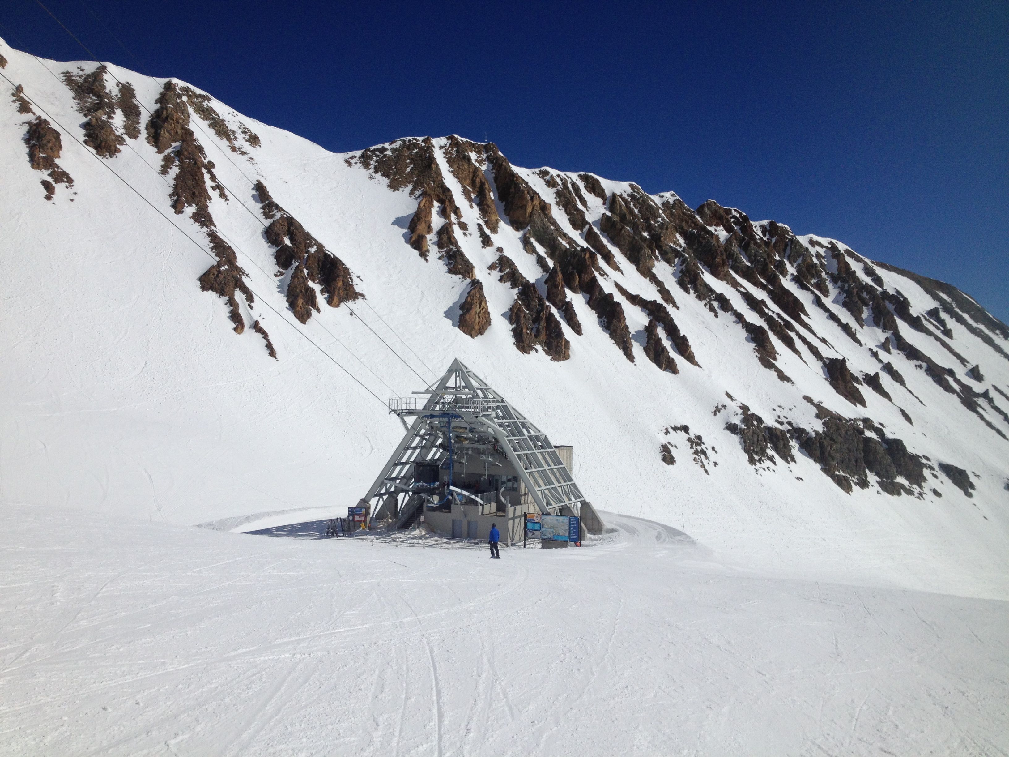 The conditions were wonderful albeit slightly hot for skiing. But no matter. It was simply stunning outside. I convinced my husband to take the gondola up to the very top. Little did he know what he was getting into…the only way down was a black or double black diamond.