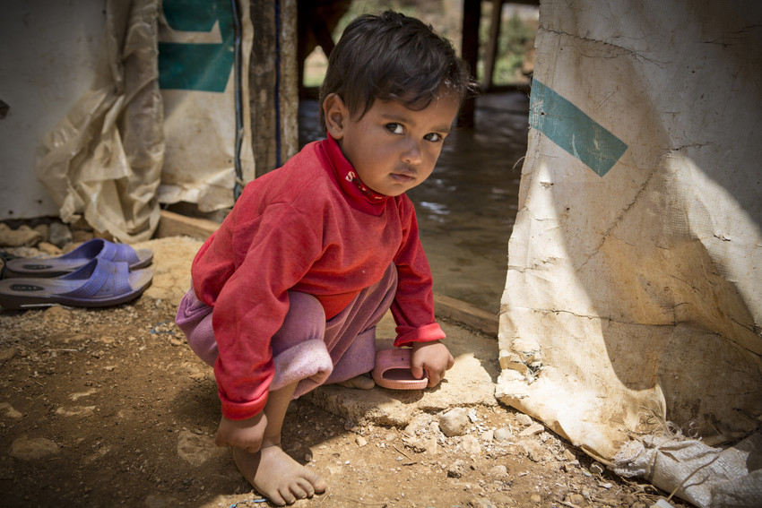 Rami*, two, at her home in a tented refugee settlement in Lebanon, near the Syrian border. *Names have been changed to protect identity. Photo Credit: Jonathan Hyams/Save the Children