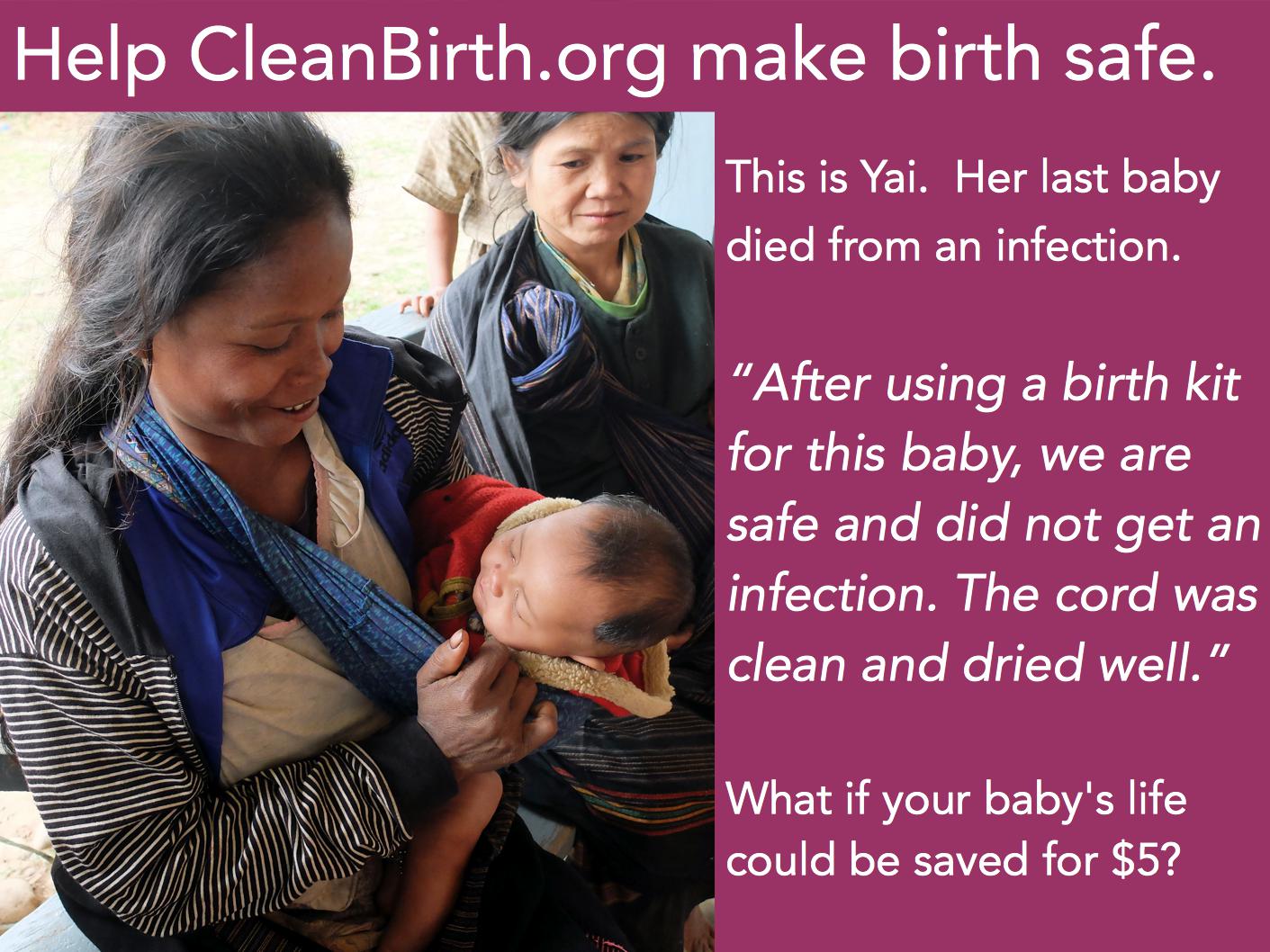 Why I find CleanBirth.org so remarkable is how incredibly easy and cost effective it is to save a life. Look at the story of Yai below. Her last baby died from an infection caused by an unsafe birth. CleanBirth.org was able to provide Yai with a hygienic kit for $5 before the birth of her next child which not only saved the mother but also her child.