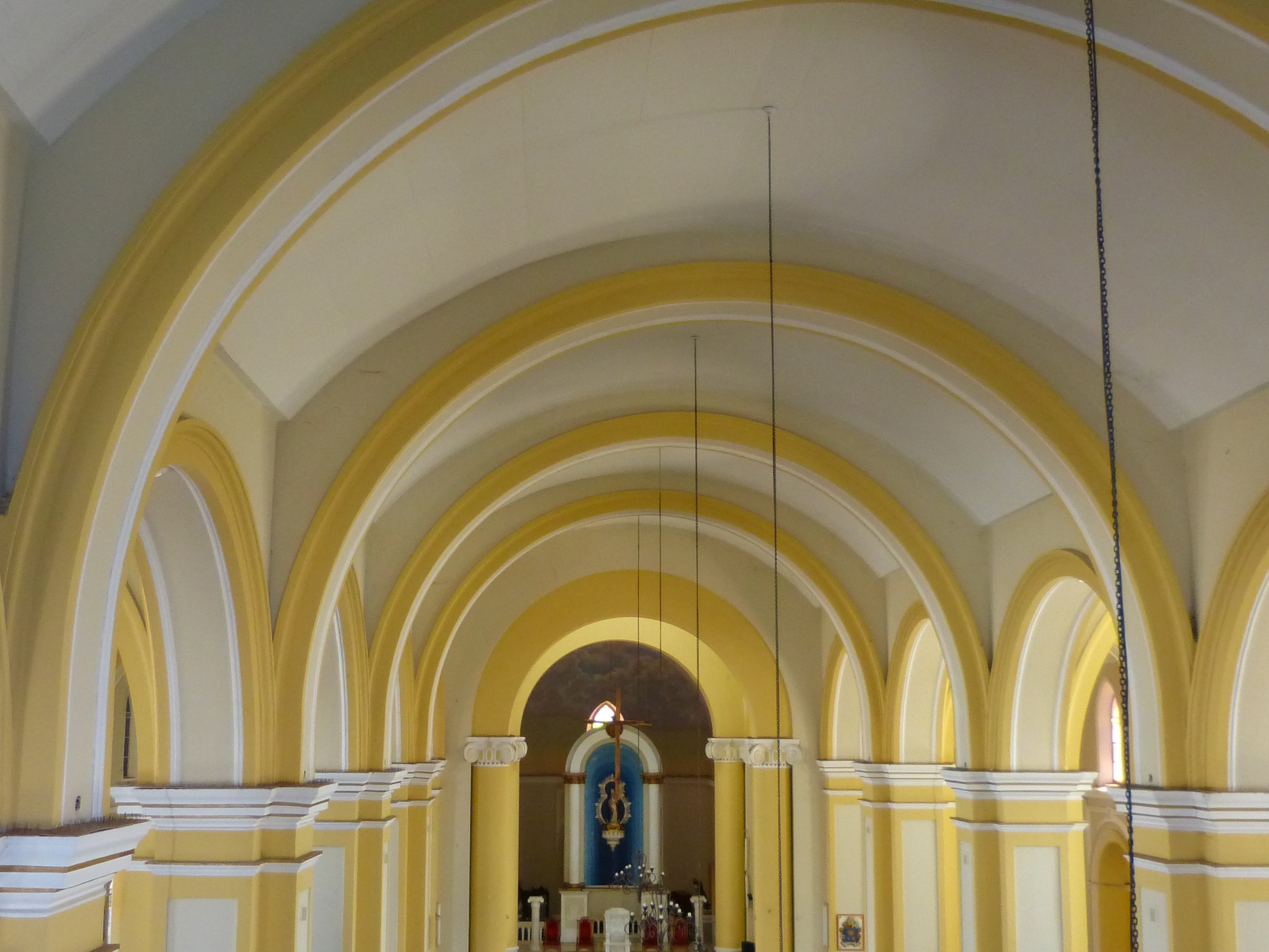 The interior of the church has three naves and four chapels, and is decorated with extensive stained glass windows.