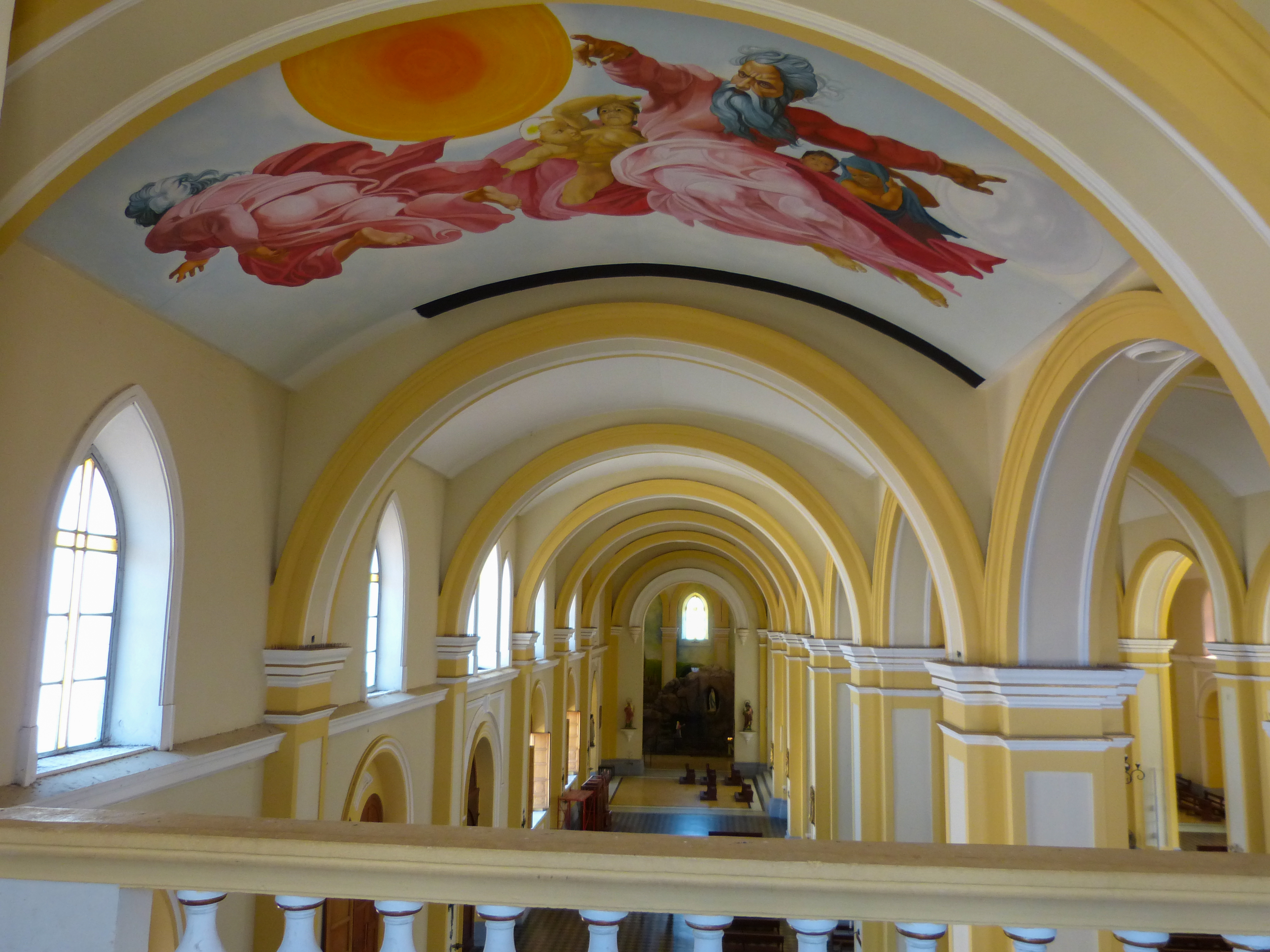 The interior of the church has three naves and four chapels, and is decorated with extensive stained glass windows.
