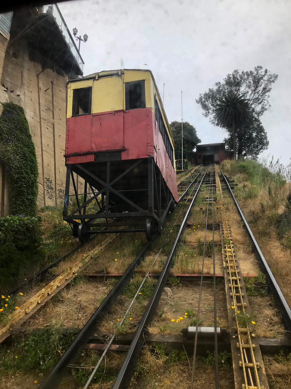 To reach the top of Cerro Artillería, you can either walk directly up the hill or else take an ascensor. We decided that It was time to take our first ride on an ascensor and quite honestly judging by the looks of it I was a little bit nervous. Built in 1892, the Ascensor Artillería is one of a handful of ancient funiculars transporting the people of Valparaiso for over one hundred years. Given Valparaiso’s steep terrain and multitude of hills (there are 42 cerros in all), these fascinating cars are part of the protected cultural heritage of Valparaiso and are considered historic monuments. They also save the legs and knees from all the hard walking.