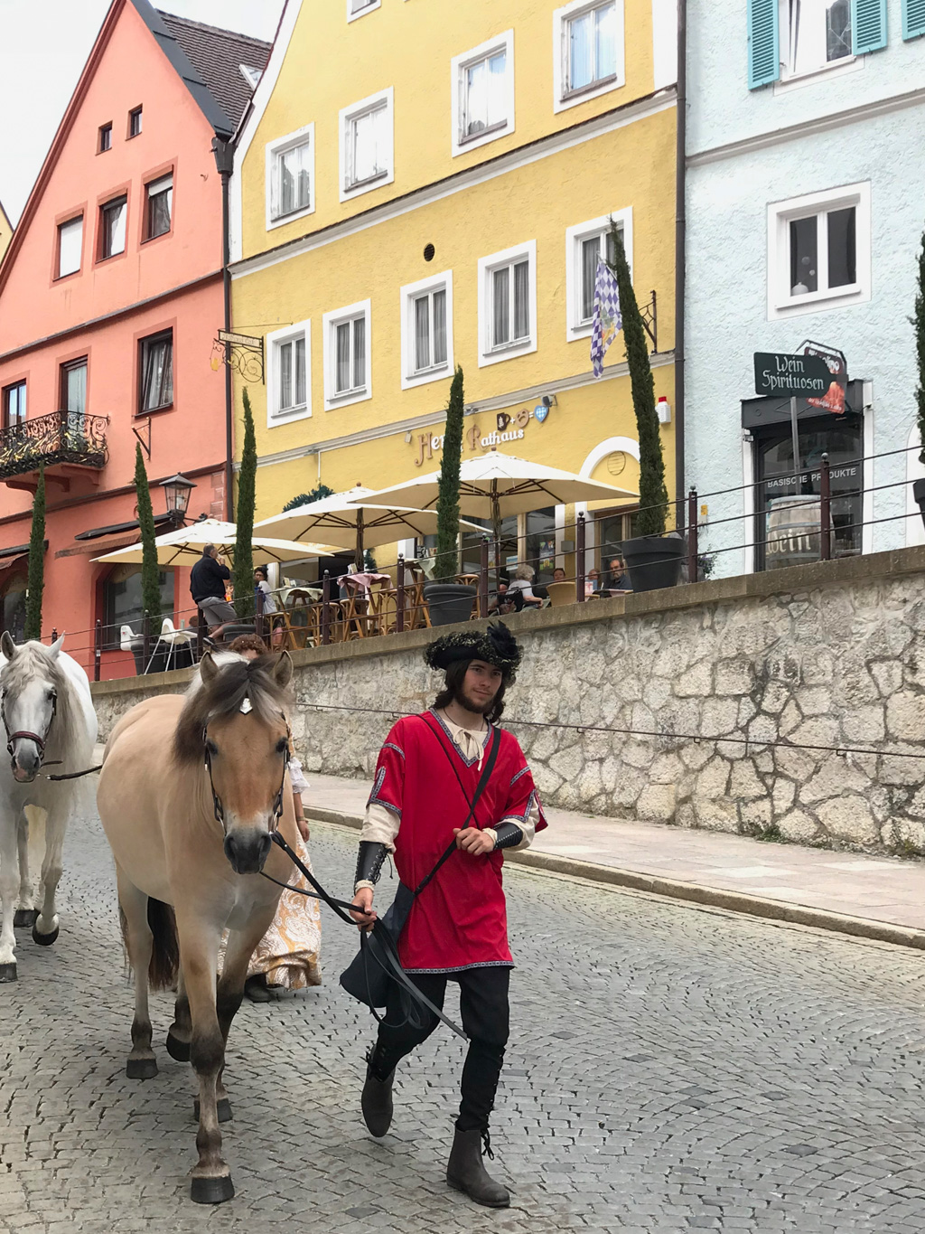 Füssen is less than a ten minute drive from Schwangau located just west of the Lech river that empties into the large lake, Forggensee. After we found parking and struggled with the meter (not knowing that on Saturdays parking is free), we headed on foot towards Altstadt, the Old Town and heart of Füssen. As we were walking we began to notice a few people dressed up in medieval clothing. Some men were wearing long capes and lederhosen (shorts made of leather) and the women adorned dirndls (a traditional German outfit which consists of a bodice and skirt or a pinafore dress, a low-cut blouse with short puff sleeves, full skirt and apron). At first I brushed it off and thought perhaps they worked at a tourist restaurant or theater in town that required the costume. But as we got closer into the center of town, we saw more and more people dressed in clothing from medieval times. We joyfully realized that we had come on the day of a traditional folk festival.  Best of all, it was completely free.