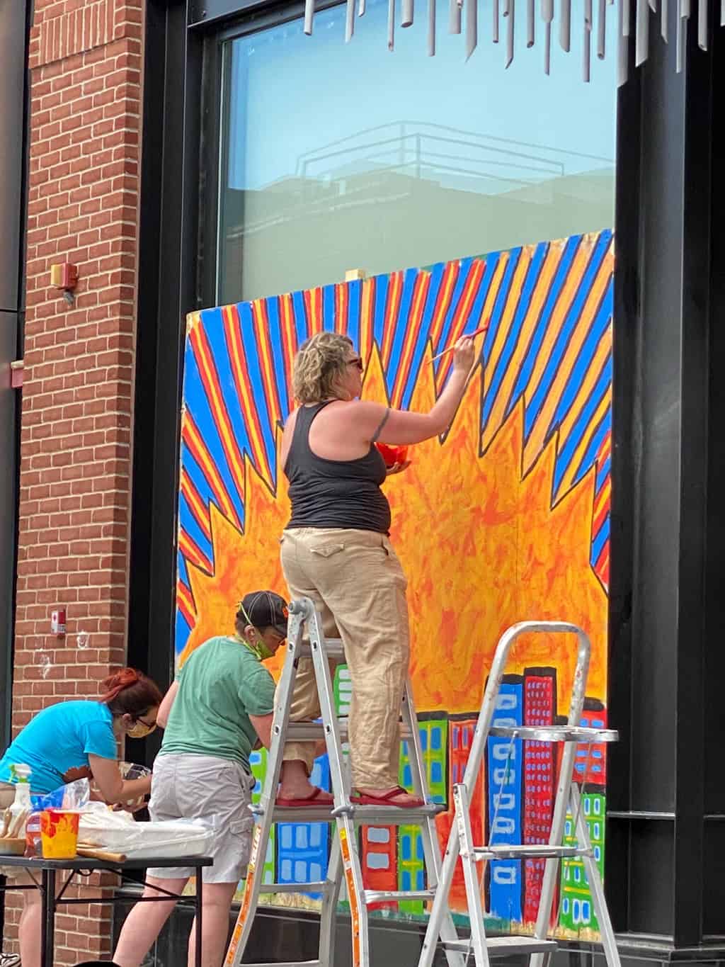 Not long after George Floyd’s death, Jill Osieki of the Uptown Association sent out a call to local artists to work on the murals along Hennepin Avenue and Lake Street in Uptown. Heather jumped on board and helped coordinate the effort with her two friends, Shane Anderson and Greta Sandquist. She also reached out to all the artists in a co-op she is a part of called Creative Badasses. The Creative Badass Collective was formed by a core group of Minnesota-based female artists in 2018 with a common vision to support, motivate, and inspire each other creatively and professionally. Holly Keller and some other local artists from the Creative Badasses Collective joined in such as students from PiM Arts High School (The Visual Arts head, Becca Johannsen, galvanized 60 students to come work at the site, bringing their own designs). Other artists from as far out as Princeton, Minnesota (an hour’s drive away) have joined in for a city-wide, volunteer-led effort to paint the murals. Buildings could ask for a certain theme or have else left it up to the artist to create their own mural.