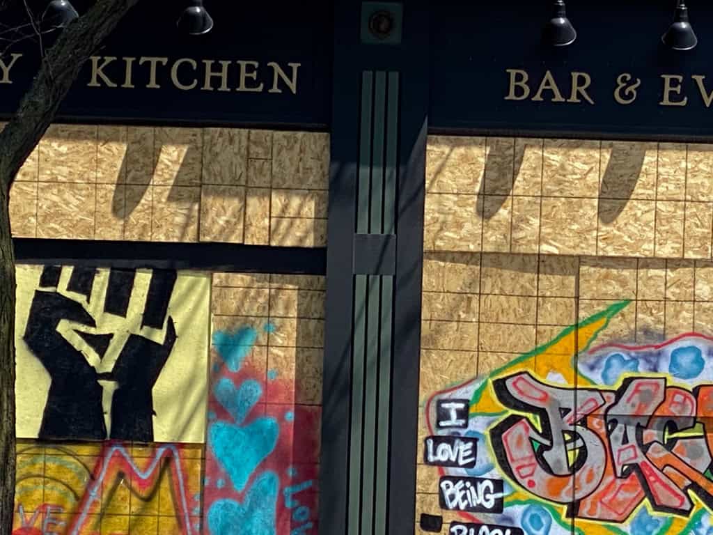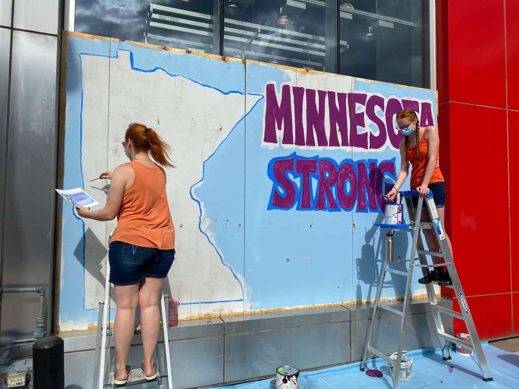 The Seward Neighborhood is right in the heart of the Fifth Precinct where the peaceful protests turned violent and most of the surrounding buildings were either looted, damaged or destroyed. It has been amazing to see the community-led volunteer groups who immediately helped clean up the streets to make it safe. I drove down there with my daughter shortly after the chaos ended and the clean-up efforts were underway. I wanted her to see it. While there was no art going up there yet, an incredible amount of existing street art lies down Lake Street which I documented a couple of years ago in my post: My Epic Guide to Exploring Street Art in South Minneapolis.