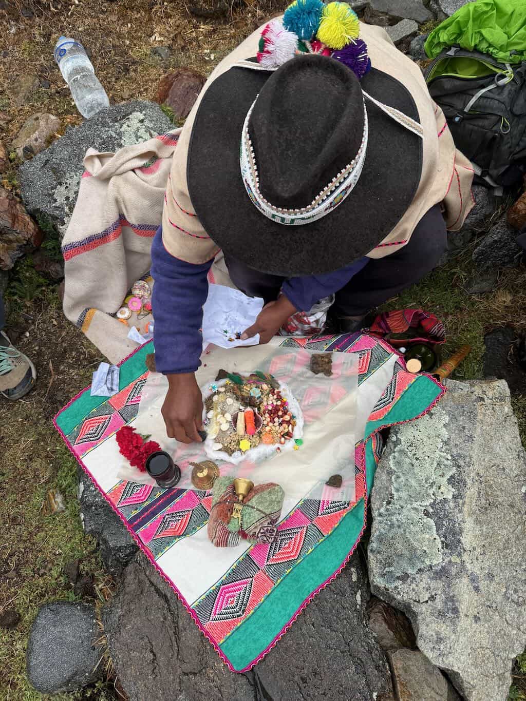 As Sebastian laid out the items for the ceremomy it started to drizzle, making it all the more mystical. Our guides Claudio and Gilberto translated for us as Sebastian chanted his prayers. The ceremony is an offering to say “thank you” to Mother Nature. August (the month we were there on the hike) is considered the month of Mother Earth.
