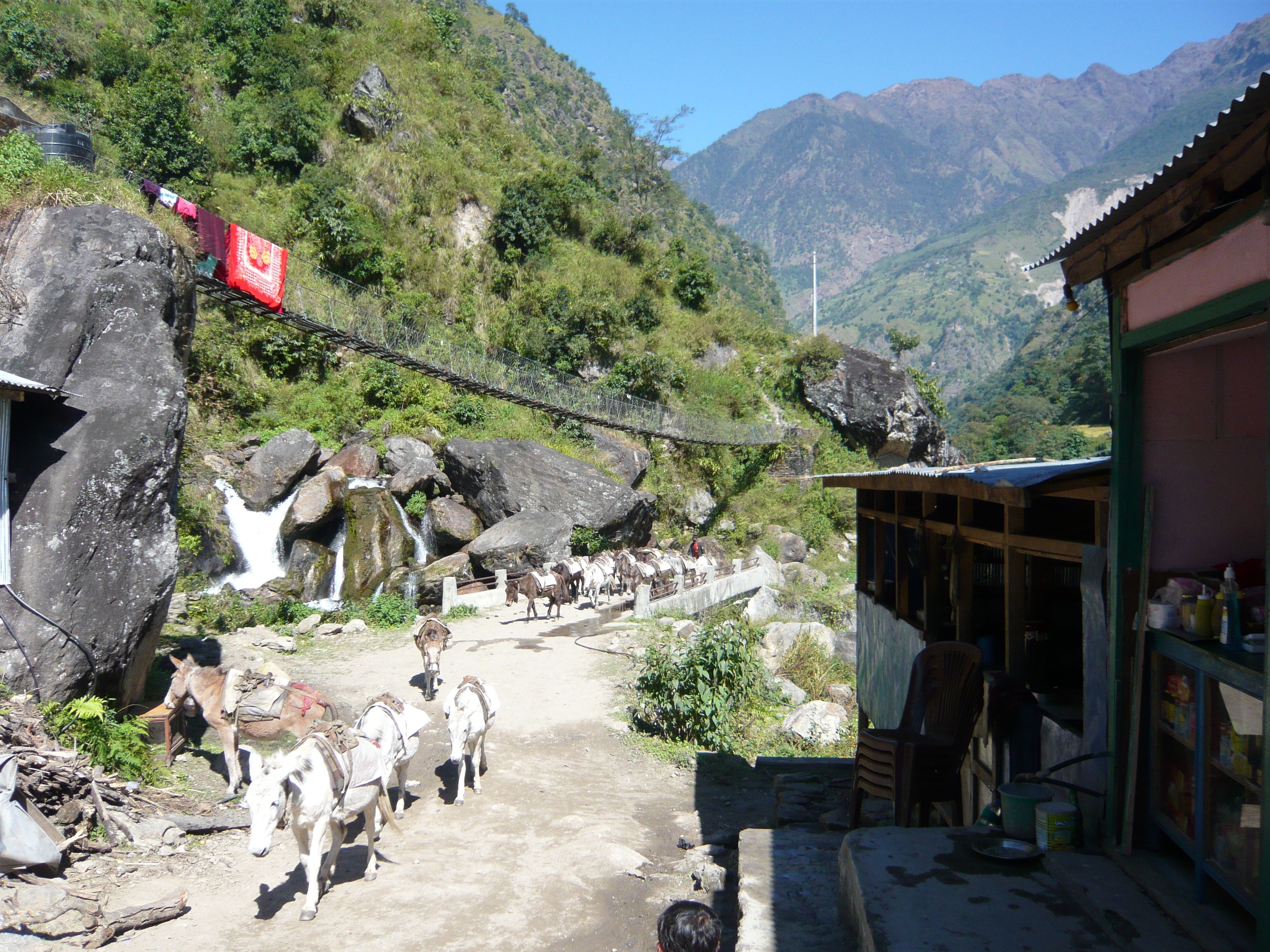 Along the Annapurna trail, you walk through many villages and are greeted by the rural Nepalese, goat herders, chicken sellers, mule trains, and yaks.