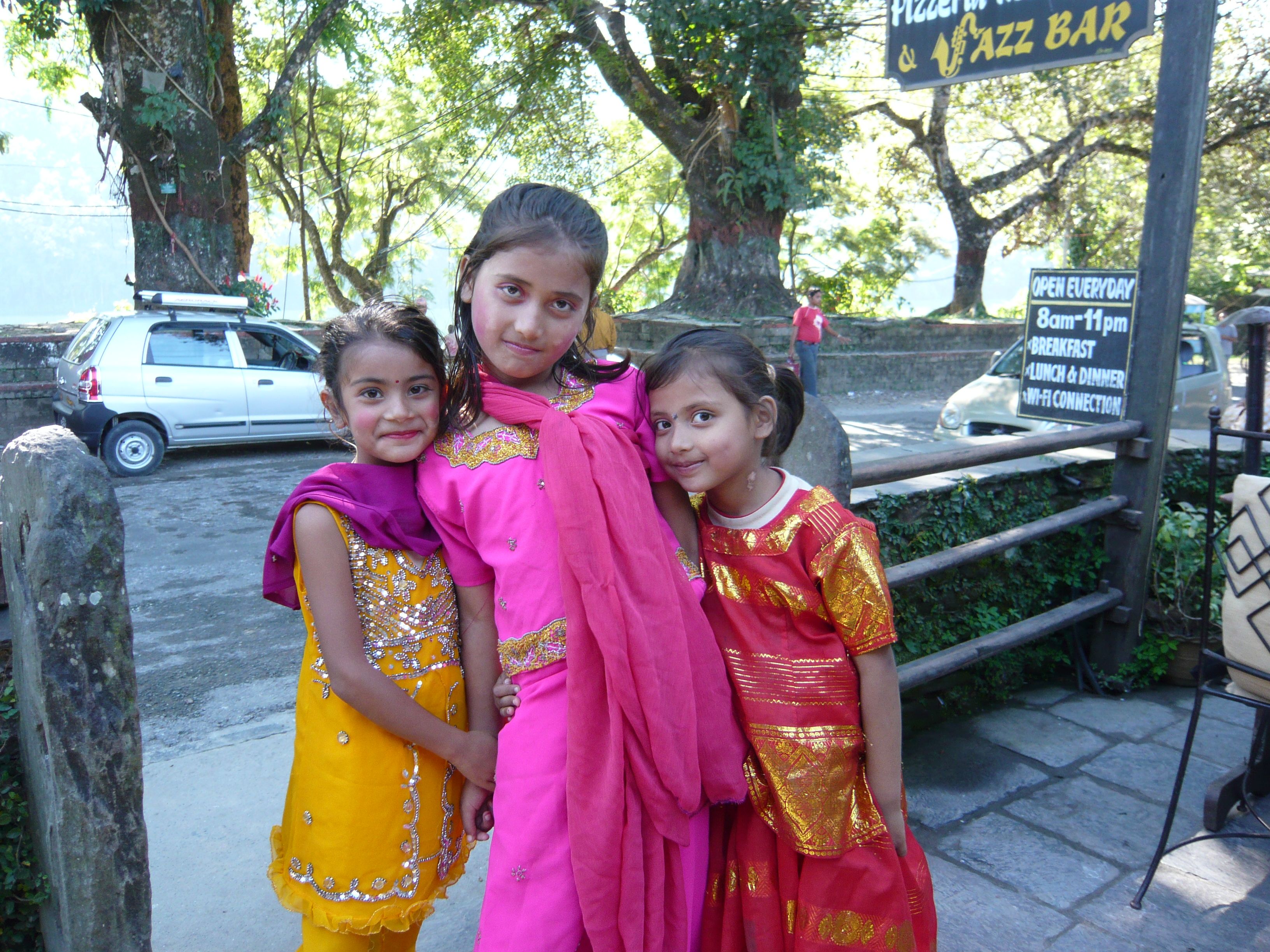 Photo of three Nepali girls dressed in their finest clothing in honor of the Festival of Lights, one of the biggest holidays in Nepal. The girls went from table to table, singing and dancing and then asking for a small donation to help pay for school.