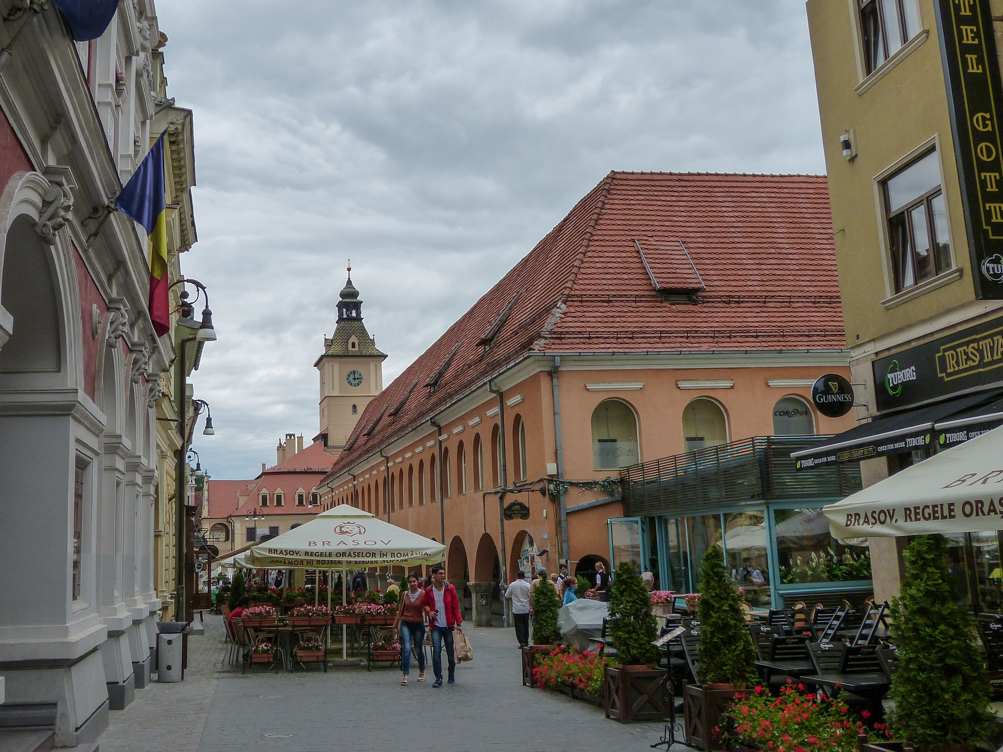 After touring the church, the winds came in and swept away the rain clouds. The sun appeared and shined down on the square illuminating its buildings and bringing Brasov to life. Families were out playing with their kids by the fountain. Couples were walking hand in hand. People were enjoying a cool drink at one of the many lovely outdoor cafes in the square. Meanwhile I was taking pictures of the lively, colorful buildings that lined the square and were even more brilliant with the afternoon sun.