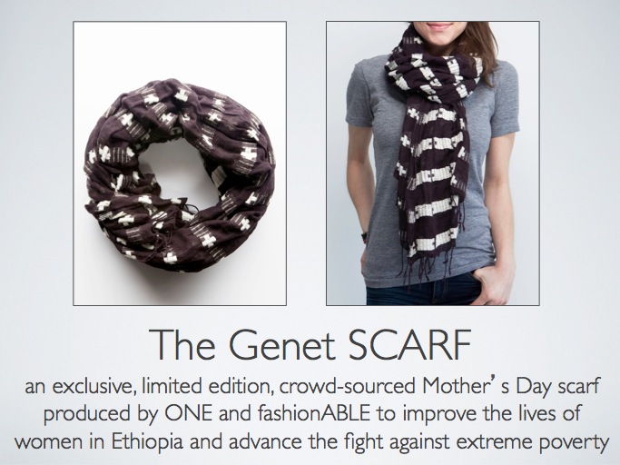 A few months ago, a competition was held by ONE | fashionABLE | ALTchallenge / contest where the Alt community was challenged to design a scarf to be voted on by conference attendees and then handmade in Ethiopia for an exclusive ONE | fashionABLE Mother’s Day Scarf. Fast forward to early April and the winning Mother’s Day scarf is now hitting the markets in the US. Each handmade scarf takes three days to make and is named The Genet after one of the amazing women who helped produce it.