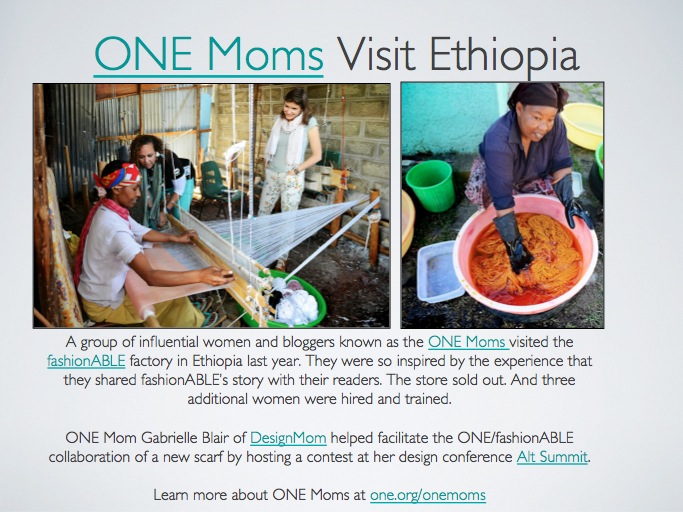 During the ONE Moms/Mums trip to Ethiopia last fall, the women visited fashionABLE, a nonprofit that works to empower women and create sustainable business in Ethiopia. Most of these women were rescued from prostitution and have been helped by fashionABLE to live a productive, healthy life for themselves and their children.